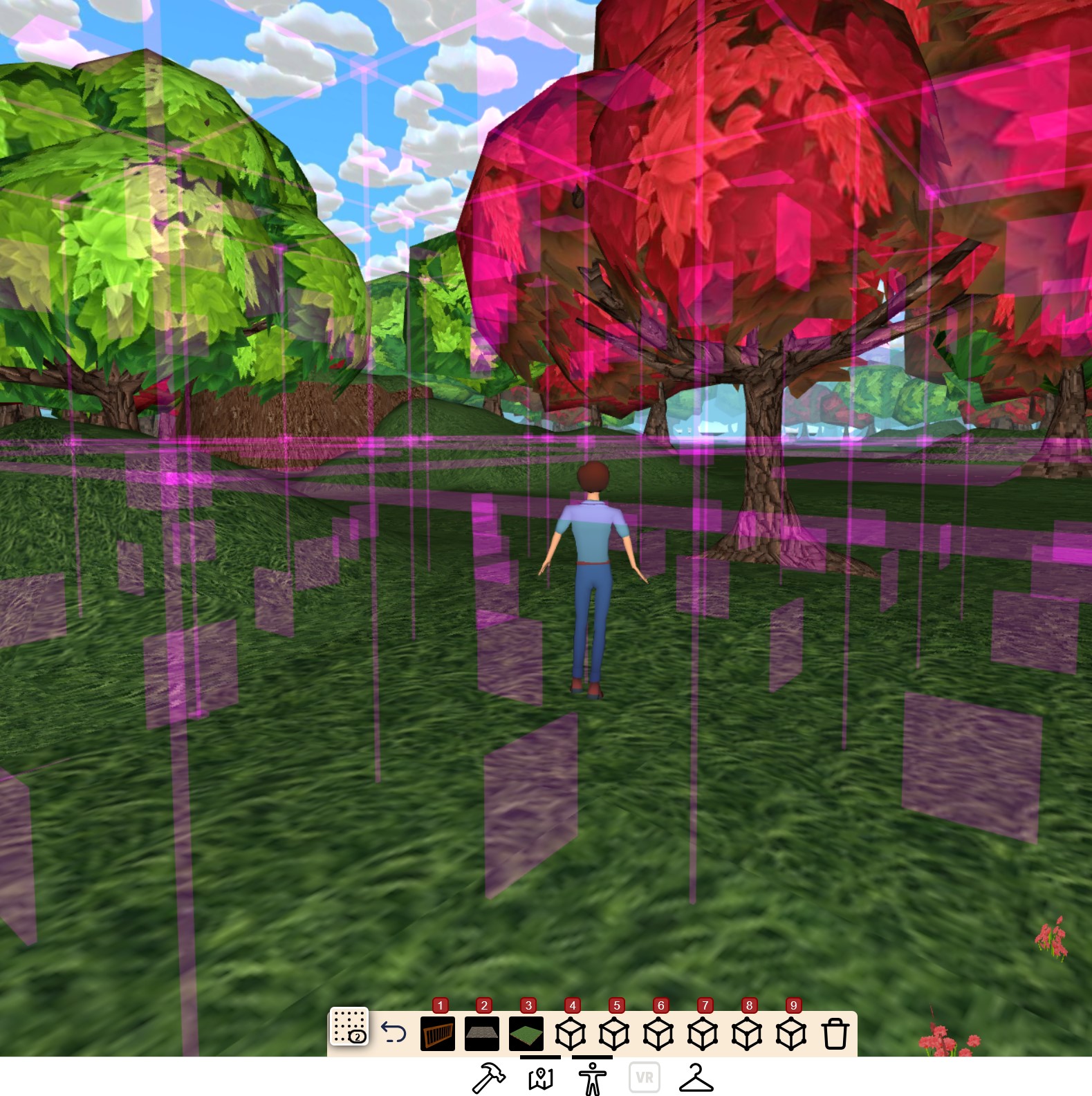 Opening the “build bar” will automatically switch the user to “edit mode.” By clicking and selecting any item in the world, users will be able to move, scale, rotate, or remove the item. More details on this will follow. For now, let’s add a tree!
