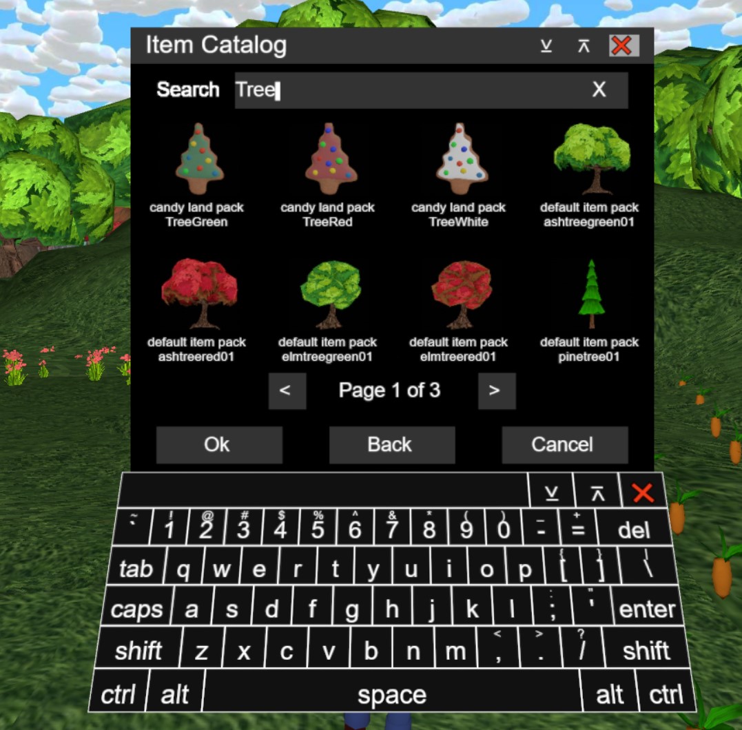 By using the search box and typing “tree,” the list will be filtered to show all tree models in the catalog. Clicking on the desired tree will add it to the selected “model palette” slot and set it as the current “build mode” tool.