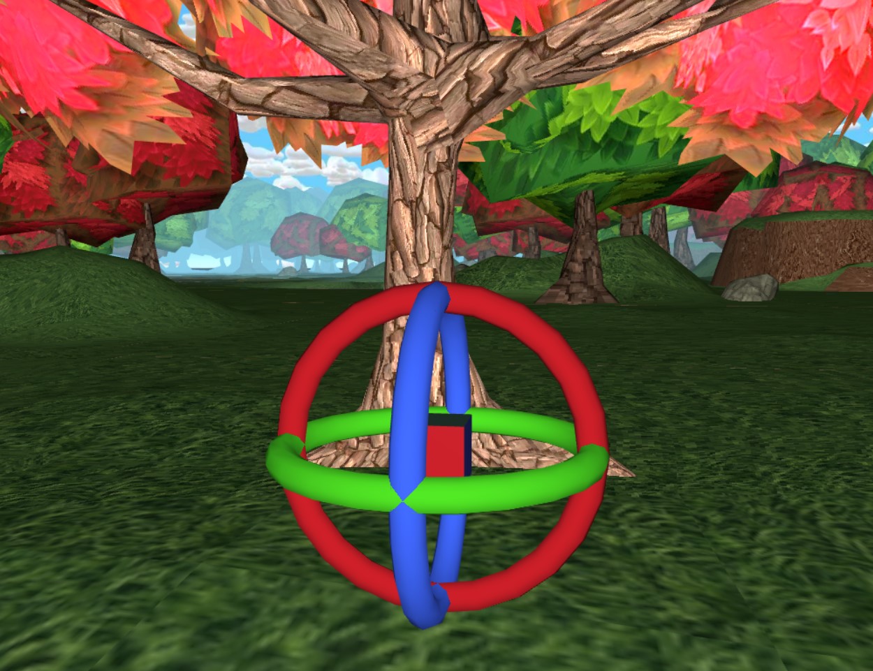 Single-clicking the “edit tool” center cube again switches to “rotate mode.” Rotation is done by dragging the corresponding rings around the X, Y, and Z axes. Nudging the item’s rotation by 45-degree increments is done by clicking on the ring.